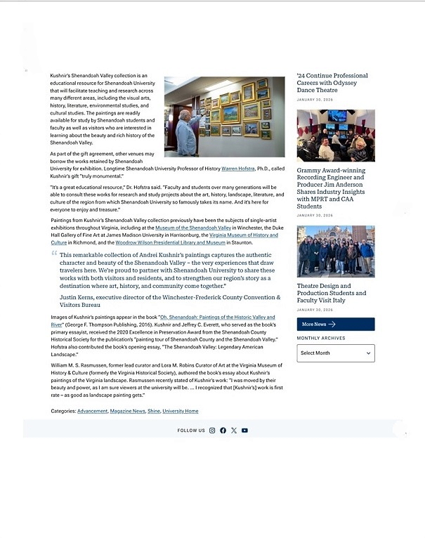 February 12, 2026 Shenandoah University Celebrates Gift of 231 Paintings from Andrei Kushnir's "Oh, Shenandoah" book during Founders Day Event.